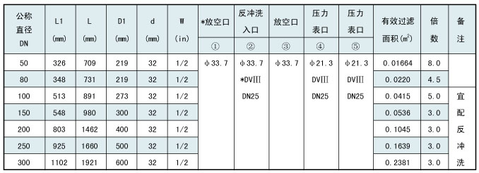 | 注:1、*设计流量按V=2m/S计算 2、**该过滤面积是以滤孔为φ1的冲孔板所计算的值;孔径不同,其有效过滤面积也有所不同。 |